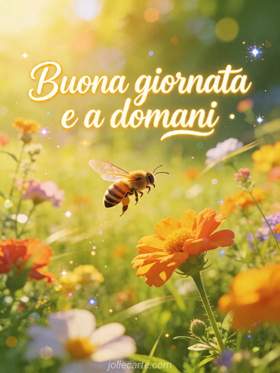 Condividi questo bellissimo biglietto di buona giornata e a domani con sole dorato, fiori di campo colorati e un'ape felice. Puoi anche scoprire immagine buona serata e buonanotte a domani, buona serata buonanotte baci a domani e paesaggio buona serata a domani.