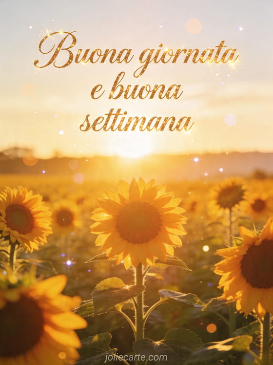 Condividi un luminoso augurio di buona giornata e buona settimana con questa soleggiata cartolina con girasoli. Scopri anche settimana soleggiata, citazione buona settimana o buongiorno buona settimana.