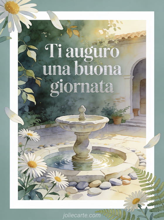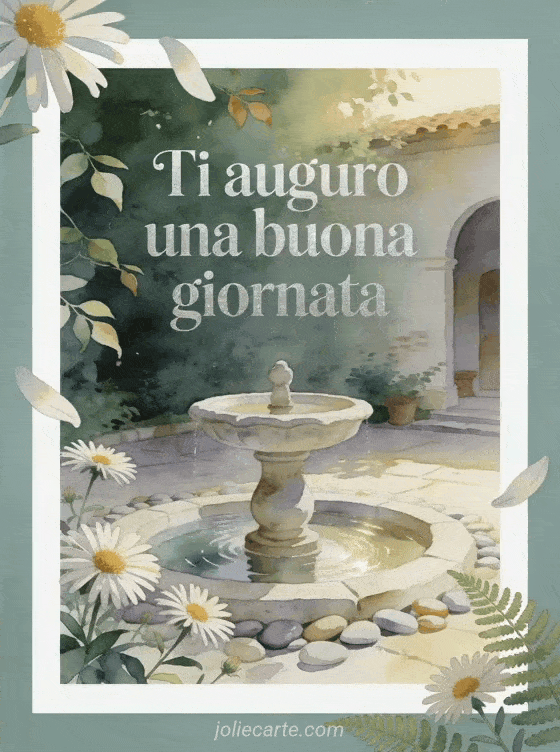 Augura una buona giornata con una fontana di pietra tranquilla, un cortile verde, fiori di aster, ciottoli lisci e acqua increspata. Scopri anche una buona giornata cane gif, gif cuore buona giornata o buona giornata testi.