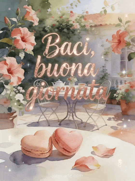 Condividi un saluto affettuoso di buona giornata con scritte oro rosa, un tavolo da tè accogliente in un cortile fiorito, fiori di ibisco, macaron a forma di cuore, petali sparsi e luce del mattino morbida e scintillante. Puoi inviare anche un buona giornata sole gif, un buona giornata paesaggio gif o buona giornata buongiorno buona giornata gif.