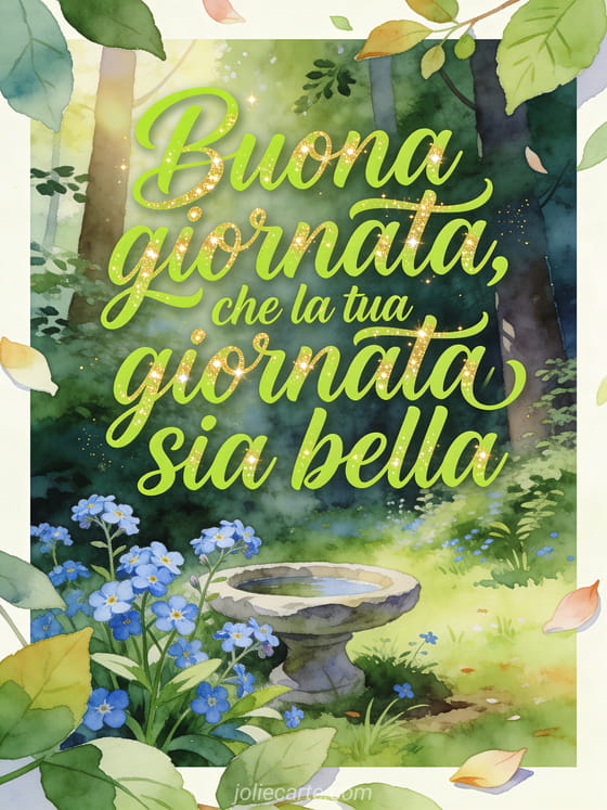 Augura una giornata bella con un biglietto ad acquerello di una radura nel bosco, fiori non-ti-scordar-di-me, foglie fresche e una piccola vasca per uccelli in pietra. Scopri anche un biglietto di gif buongiorno e buona giornata, buona giornata baci gif o buona giornata caffè gif.