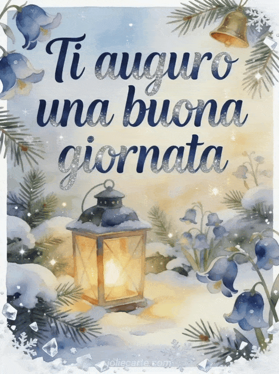 Augura una buona giornata con un giardino d'inverno accogliente, una lanterna accesa, neve soffice, rami di pino e campanule nella calda luce dell'acquerello. Condividi questa cartolina scintillante e scopri anche buona giornata immagine con baci, buona giornata sole gif o buona giornata paesaggio gif.