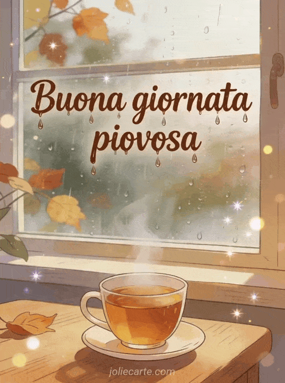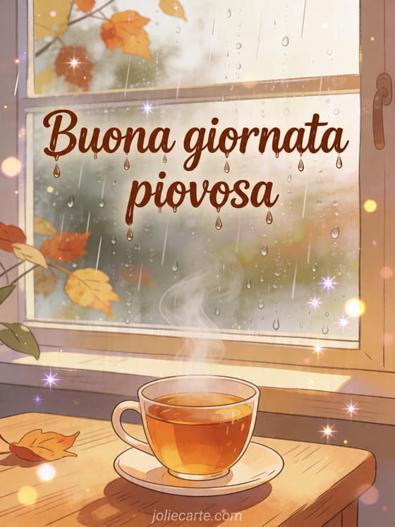 Porta calore in una giornata piovosa con questo biglietto accogliente che mostra una tazza di tè fumante vicino a una finestra coperta di gocce con foglie d'autunno all'esterno. Scopri anche bacini gif buona giornata bacini ti amo, baci bella giornata gif o tanti baci buona giornata.