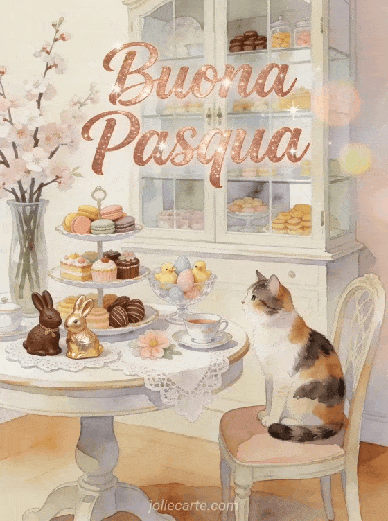 Condividi questa gioiosa gif animata di Pasqua con un adorabile gatto calico, uova di Pasqua e ciliegio in fiore. Scopri anche immagine buona Pasqua gratis o immagini Pasqua gratis.