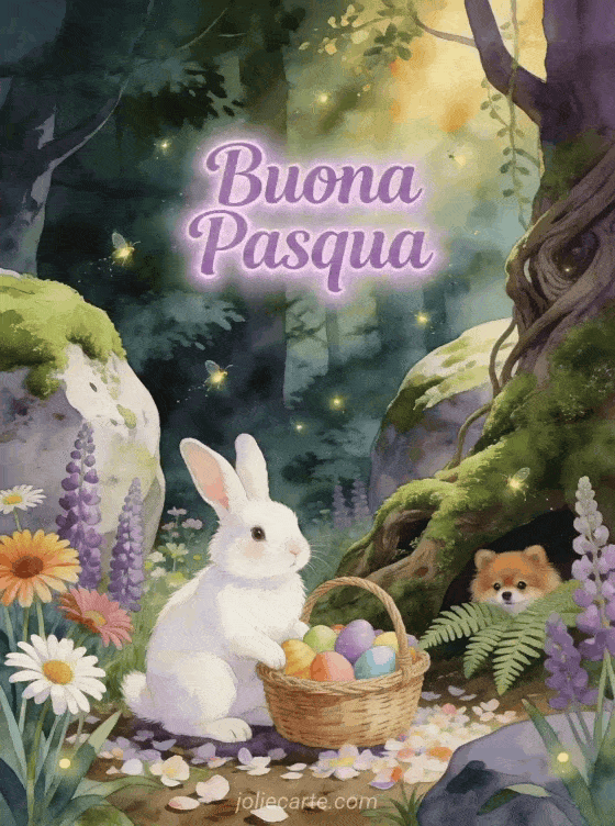 Condividi una magica GIF animata di Buona Pasqua con un coniglio bianco in una foresta incantata piena di uova di Pasqua e lupini. Scopri anche una bella cartolina Buona Pasqua o il testo buona Pasqua.