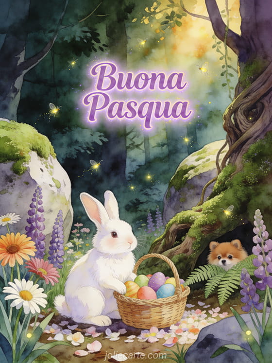 Buona Pasqua GIF animate gratis una foresta incantata con un coniglio pasquale e un Volpino di Pomerania