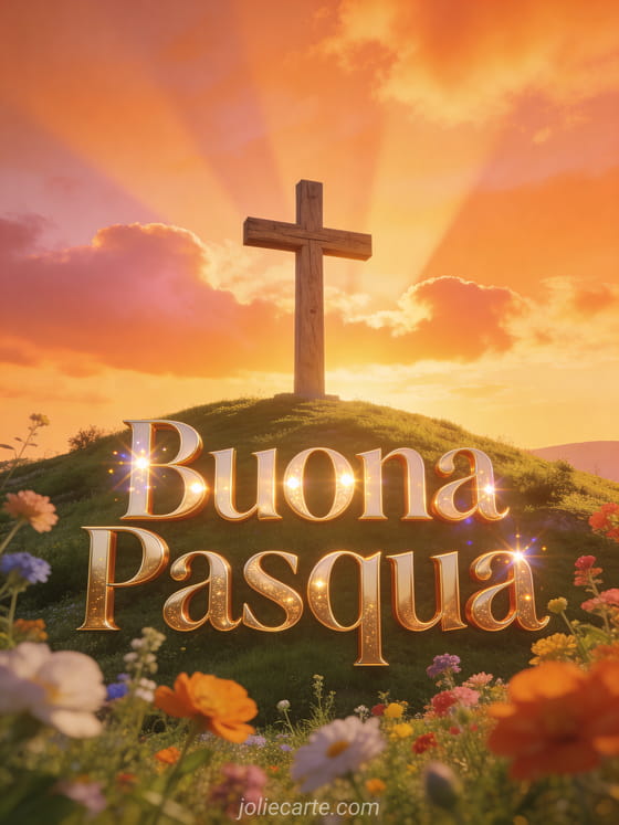 Celebra la gioia della Pasqua con questo bellissimo biglietto religioso che raffigura una croce al tramonto. Un modo significativo e gratuito per augurare una buona Pasqua benedetta ai tuoi cari.