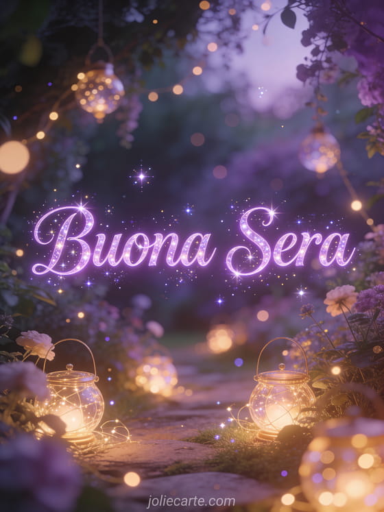 Invia una magica gif animata di buona sera con questa incantevole cartolina gratis. Un giardino incantato con luci di fata luminose e scintille fluttuanti in un'atmosfera mistica e fiabesca con toni viola e dorato, per un saluto serale veramente magico. Scopri anche una cartolina gatto buona sera o una cartolina buonasera davanti al camino.