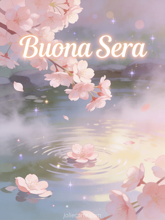 Invia un dolce messaggio di buona sera con questa bella cartolina gratis con fiori di ciliegio e uno stagno sereno. Scopri anche un piccolo messaggio per dire buona sera o una buona serata gif baci.