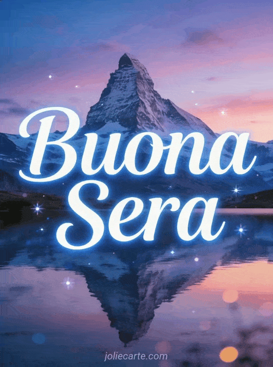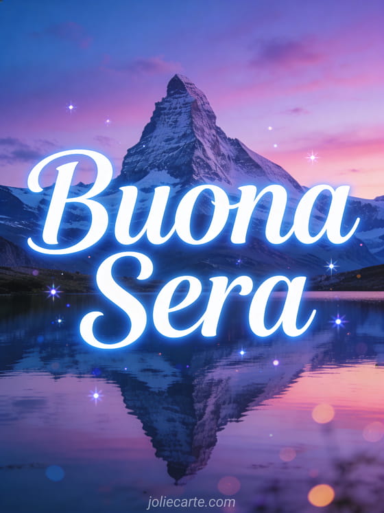 Invia una bella immagine di buona sera con questa cartolina gratis con un lago di montagna al tramonto. Scopri anche buona sera gif belle immagini tenere o un piccolo messaggio per dire buona sera.