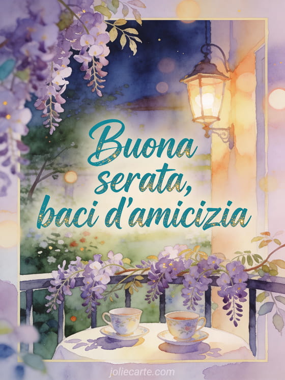 Invia teneri baci d'amicizia per la serata con scritte verde acqua, scintille dorate, glicine a cascata, due tazze di porcellana su un tavolo da balcone, luce di lanterna e un giardino serale tranquillo. Puoi condividere anche bella serata baci immagine, buona serata baci gif gratis o buona serata bei sogni immagine molto bella.