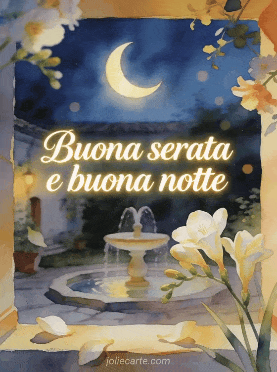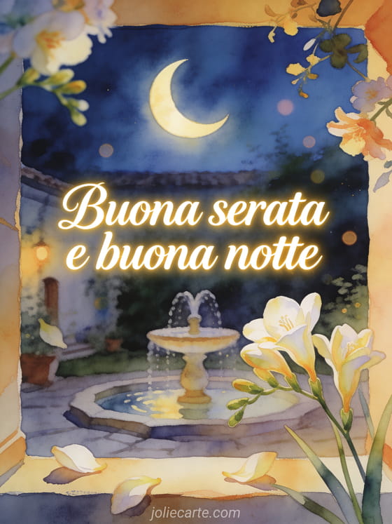 Invia buona serata e buona notte con un biglietto ad acquerello che mostra una luna crescente, una piccola fontana in cortile, fiori di fresia e un blu serale tranquillo. Scopri anche una cartolina online buonanotte, una cartolina virtuale buona serata buonanotte o un bel messaggio di buonanotte.