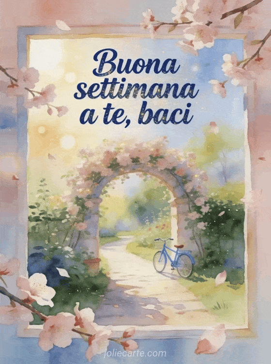 Condividi un inizio settimana luminoso con un sentiero da giardino ad acquerello, fiori di ciliegio, petali leggeri e una piccola bicicletta blu. Puoi inviare anche buona settimana a tutti e a tutte, una buona settimana divertente o serena giornata e buona settimana.