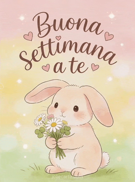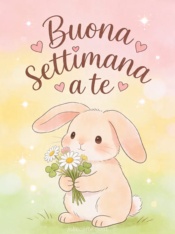 Condividi un affettuoso augurio di buona settimana con questa adorabile cartolina con coniglio. Scopri anche buona settimana baci, immagini buona settimana o buona settimana gatto.