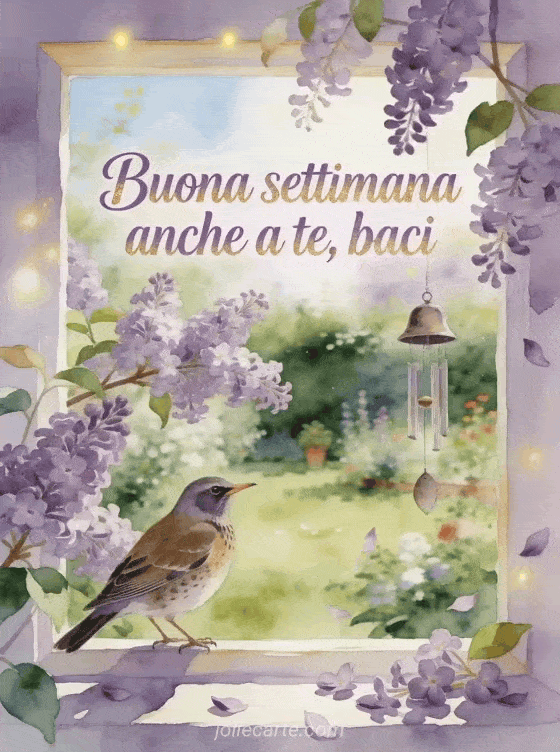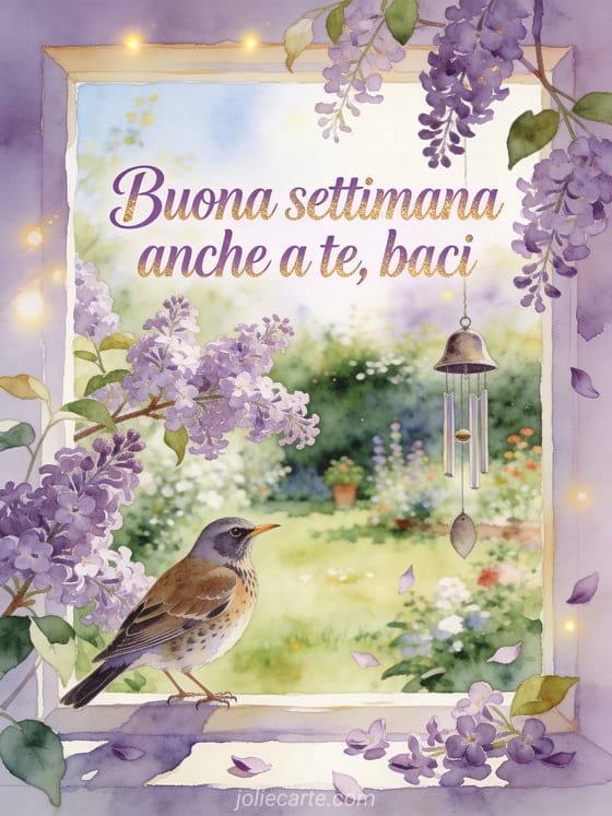 Condividi un augurio delicato di buona settimana con scritta lavanda, un tordo, rami di lillà fioriti, un carillon e luce chiara di giardino primaverile. Scopri anche buona settimana tanti baci, baci per tutta la settimana o buona settimana biglietto baci.