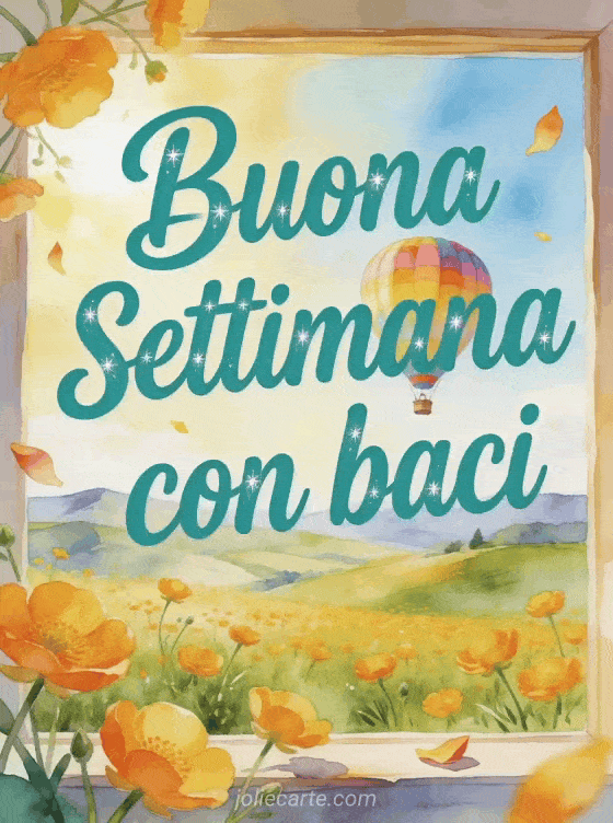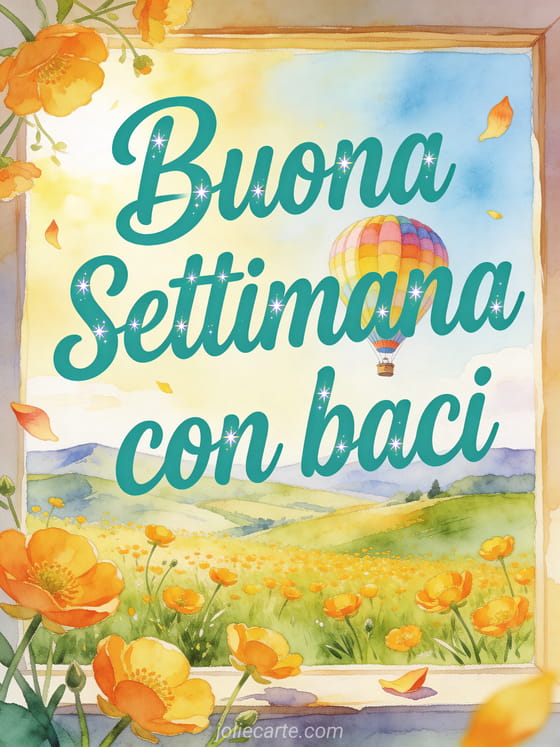 Invia una cartolina allegra di buona settimana con un prato di ranuncoli e una mongolfiera colorata che fluttua sopra colline lontane. Scopri anche una buona settimana gif baci, una buona settimana anche a te baci o una buona settimana tanti baci.