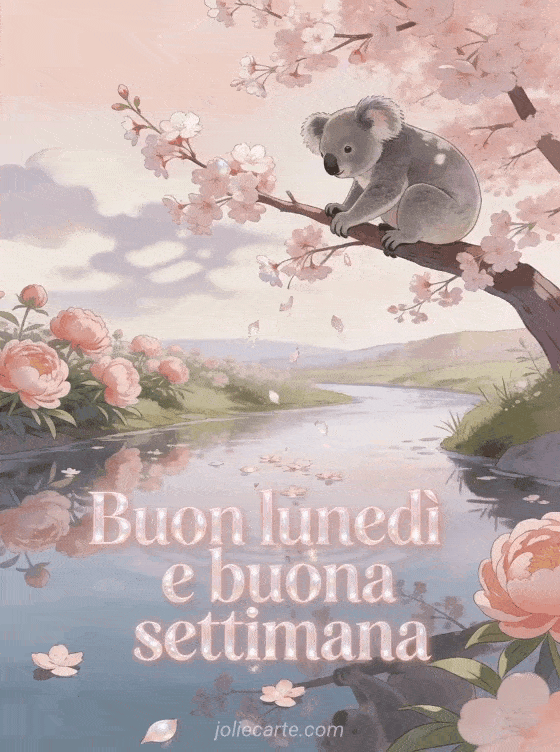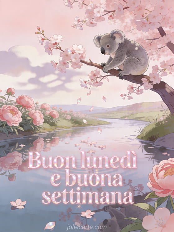 Invii un poetico messaggio di lunedì e buona settimana con questo biglietto illustrato che mostra ciliegi in fiore, peonie rosa e un koala sopra acqua a specchio. Scopra anche paesaggio buon lunedì buona settimana paesaggio, buon lunedì e buona settimana invernale o augurare un buon lunedì e una buona settimana.