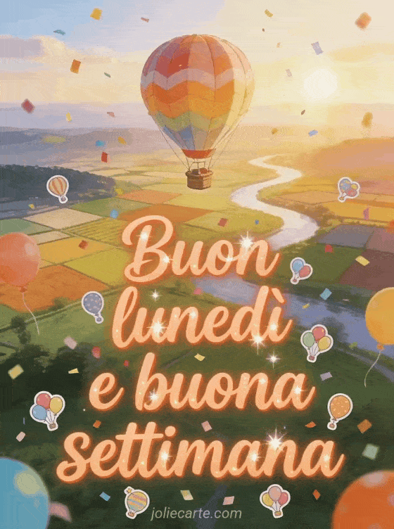 Invia buon lunedì e buona settimana con una mongolfiera che fluttua sopra una valle illuminata dal sole, campi a mosaico e un fiume sinuoso. Scopri anche cartoline virtuali buon lunedì, buon lunedì immagine scintillante o buon lunedì buona settimana gif animata.