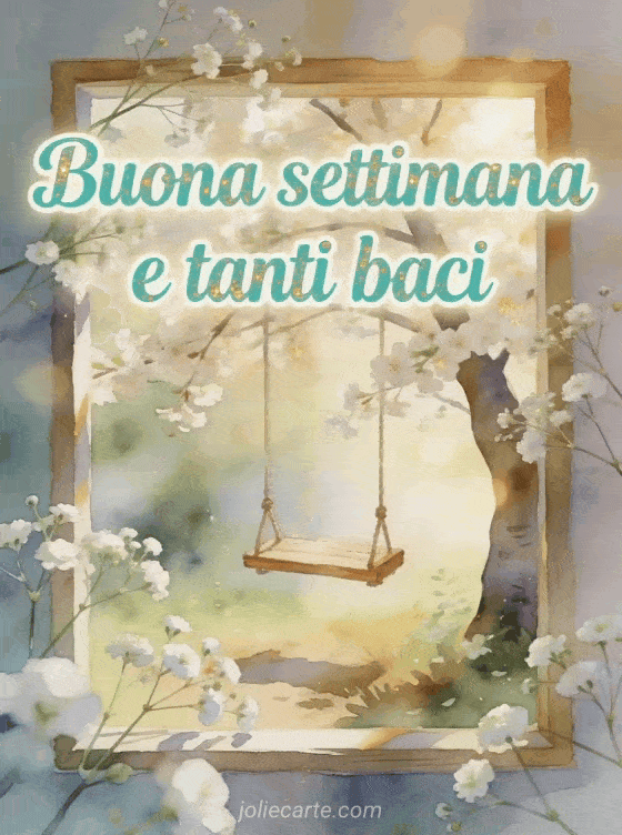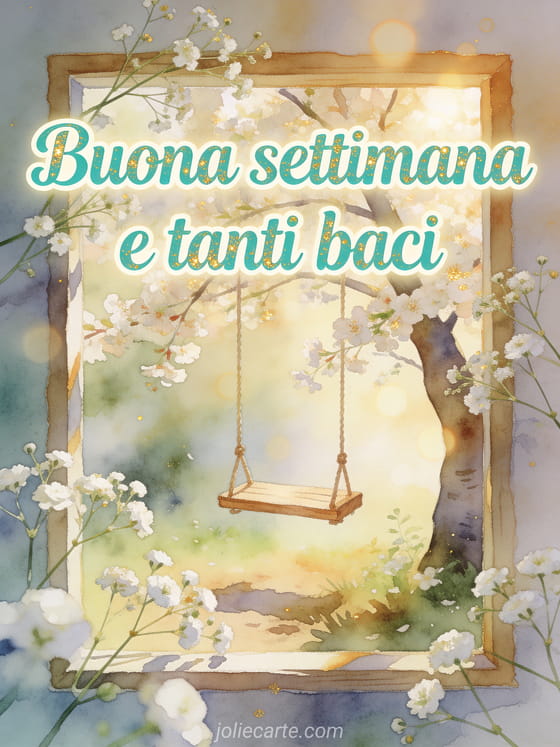 Augura una buona settimana con scritte turchesi arrotondate ad acquerello, minuscoli fiori bianchi di gipsofila, una piccola altalena di legno sotto un albero in fiore, luce dorata soffice e bokeh arioso. Scopri anche un biglietto settimana baci, un biglietto baci buona settimana o un biglietto buona settimana baci gif.
