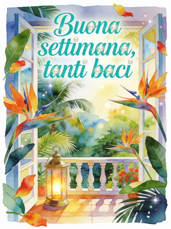 Invia un saluto luminoso di buona settimana con fiori di strelitzia, una lanterna in ottone nella luce calda e lettere turchesi ad acquerello. Scopri anche una bella settimana baci, una buona settimana e tanti baci o una immagine ciao buona settimana baci.