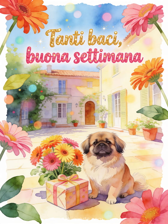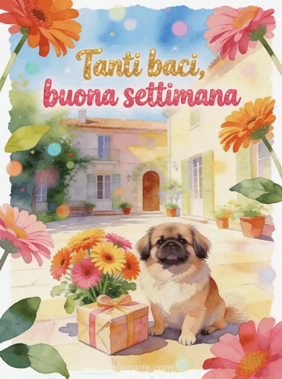 Condividi un augurio gioioso di buona settimana con scritta lampone, un cane pechinese, un regalo incartato e gerbere luminose in un cortile soleggiato. Scopri anche baci per tutta la settimana, buona settimana biglietto baci o cuore baci della settimana.