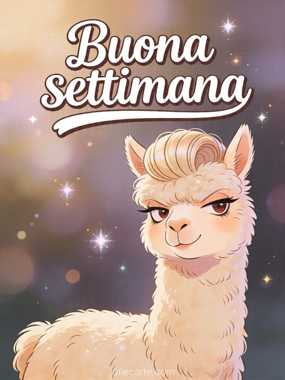 Condividi questo divertente biglietto di buona settimana con un'alpaca vanitosa, pelo soffice e un atteggiamento favoloso e impertinente. Puoi anche scoprire gifs animati buona settimana, buona settimana gif umorismo e gif buona settimana baci.
