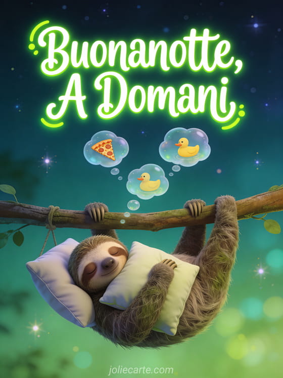 Invia una cartolina umoristica di buonanotte a domani con questa cartolina gratis con un buffo bradipo assonnato appeso a un ramo. Scopri anche buona sera a domani umoristico o buona sera buonanotte a domani.