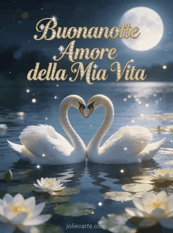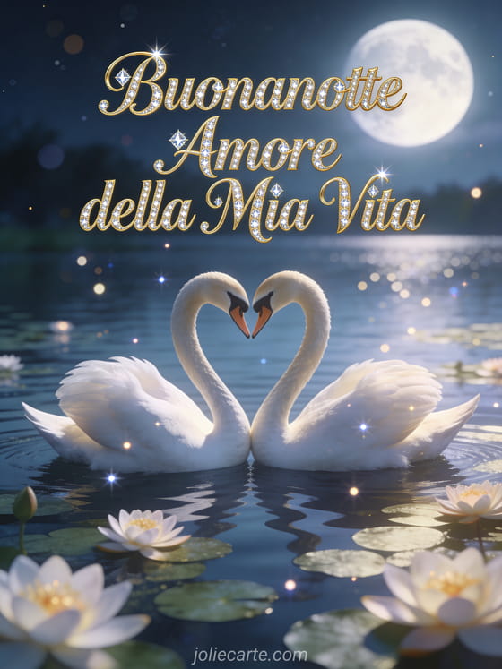 Invia un maestoso augurio di buonanotte all'amore della tua vita con questa bellissima cartolina gratis. Un elegante coppia di cigni che forma un cuore su un lago illuminato dalla luna con ninfee, per una vera buonanotte romantica. Scopri anche una cartolina buonanotte amore mio messaggio o una cartolina buonanotte ti amo amore mio.