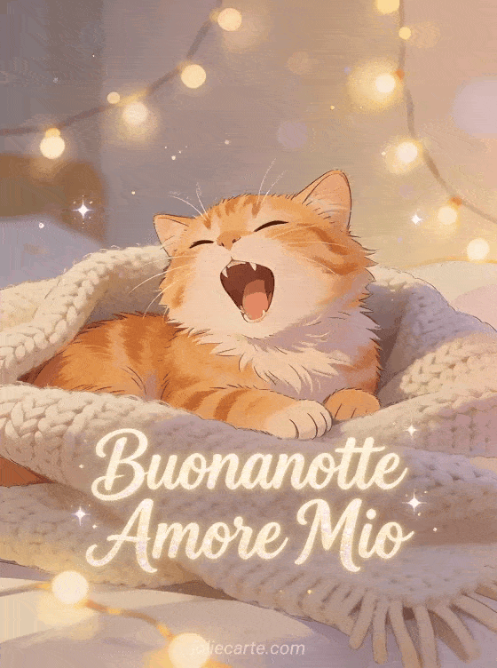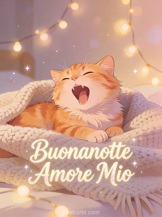 Invia un tenero messaggio di buonanotte amore mio con questa accogliente cartolina gratis. Un adorabile gatto rosso che sbadiglia su una coperta di lana con luci, perfetta per un caldo messaggio di buonanotte. Scopri anche una cartolina buonanotte ti amo amore mio o una cartolina buonanotte unico amore.