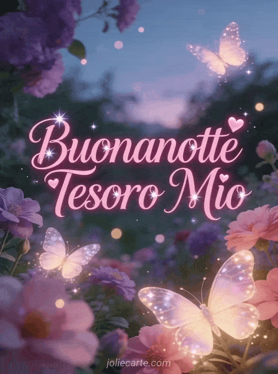 Invia un magico messaggio d'amore di buonanotte al tuo tesoro con questa bellissima cartolina gratis. Un bellissimo giardino di farfalle al tramonto con fiori viola e rosa e farfalle luminose, per una buonanotte romantica e fiabesca. Scopri anche una cartolina augurare buonanotte al tuo amore o una cartolina buonanotte messaggio amore immagine.