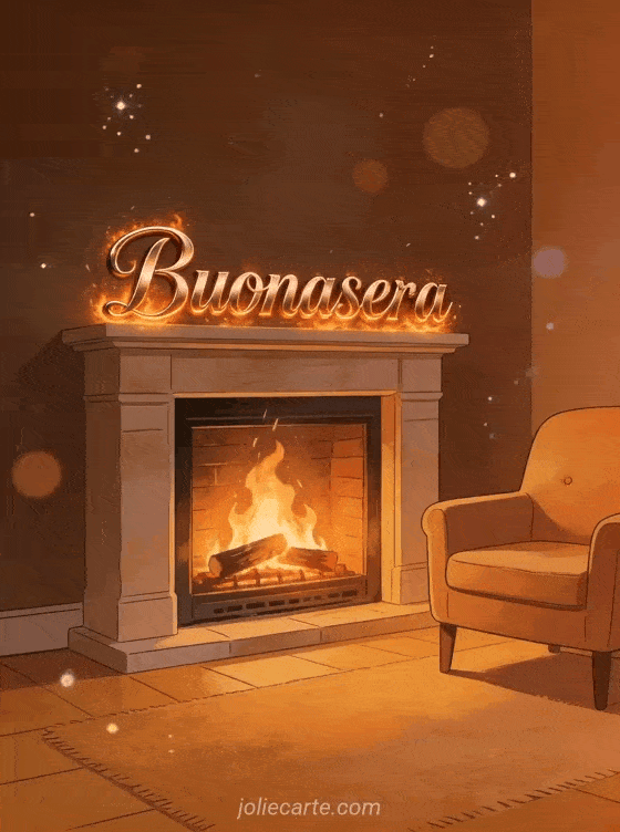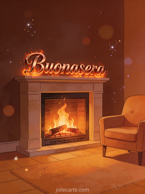Invia un caloroso buonasera davanti al camino con questa accogliente cartolina gratis. Un camino scoppiettante con fiamme danzanti e una poltrona accogliente, per un saluto serale intimo e caloroso. Scopri anche una cartolina buonasera gif immagine o una cartolina buonasera immagine con fiori.