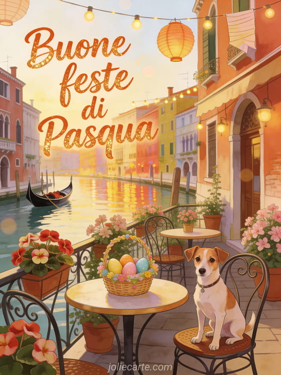 Invia belle immagini di buone feste di Pasqua con una terrazza sul canal veneziano piena di uova dipinte. Scopri anche un testo buona Pasqua o un'buona Pasqua immagine gratis.