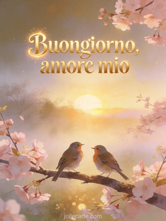 Condividi un messaggio d'amore a distanza con questo biglietto gratis del buongiorno con due pettirossi, fiori di ciliegio e dolce luce dell'alba. Scopri anche citazione mancanza amore distanza, messaggio amore a distanza o bella cartolina amore a distanza.