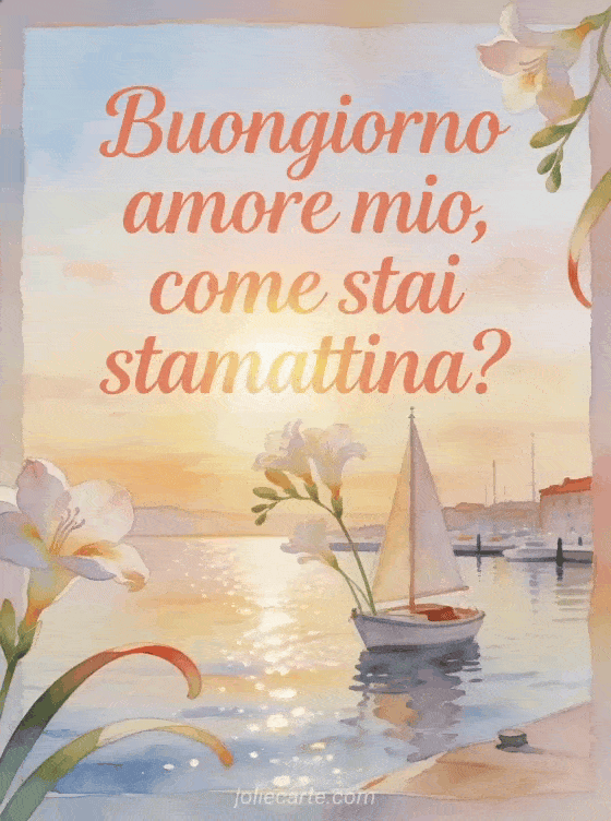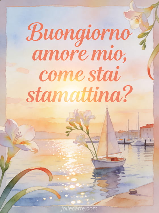 Condividi un saluto amorevole del mattino con questo biglietto ad acquerello, con fiori di fresia, foglie curve, una piccola barca a vela e un porto luminoso all'alba. Scopri anche come va il mio tesoro, sì sto bene tesoro mio o come sta mia figlia.