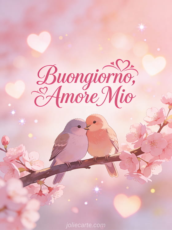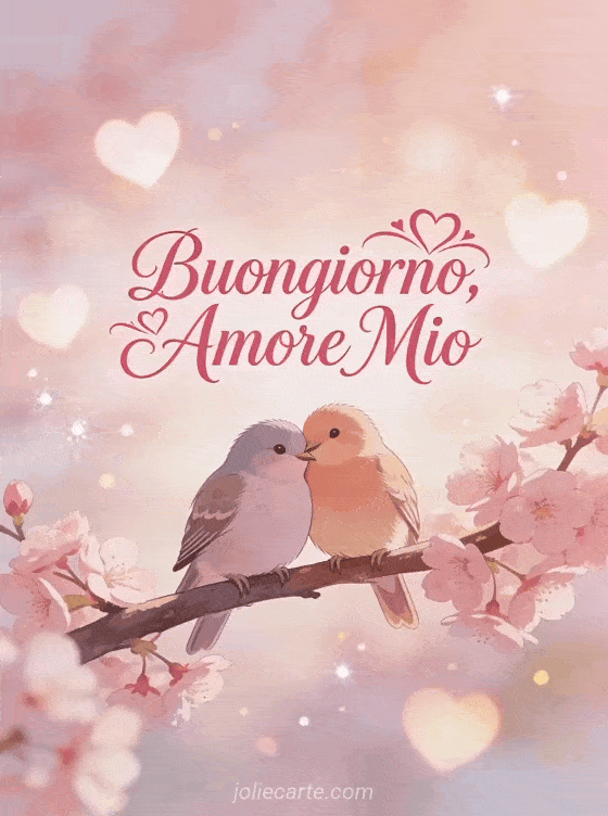Invia un romantico buongiorno amore mio con questa cartolina gratis con due uccellini che si abbracciano sui fiori di ciliegio. Scopri anche buongiorno amore mio o immagini buona mattinata.