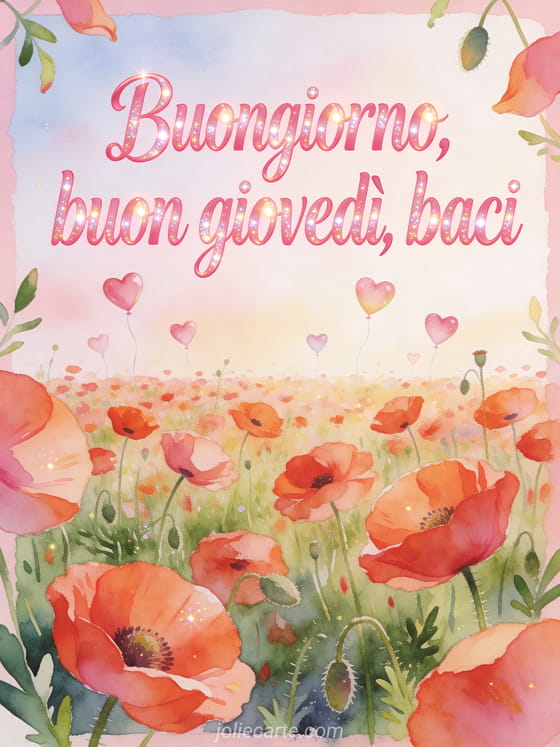 Condividi buongiorno, buon giovedì e baci con un prato vivace di papaveri ad acquerello e piccoli palloncini a cuore che fluttuano sopra i fiori. Invia questa cartolina tenera e scopri anche buongiorno buon giovedì citazione, testo per augurare un buon giovedì o buon giovedì baci gif.