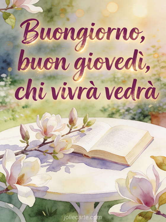 Condividi buongiorno, buon giovedì, chi vivrà vedrà con lettering prugna, un libro aperto e rami di magnolia in fiore su un tavolo da giardino luminoso. Scopri anche testo per augurare un buon giovedì, buon giovedì baci gif o buon giovedì gif animata.