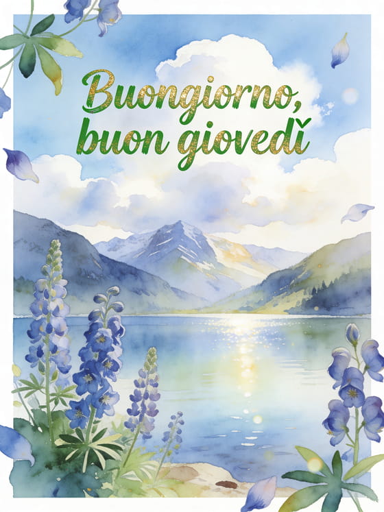 Invia buongiorno buon giovedì paesaggio con scritte verdi, fiori di delfinio, nuvole luminose e un lago di montagna brillante. Scopri anche bel giovedì baci, una buona giornata giovedì immagine o un buon giovedì con citazione.