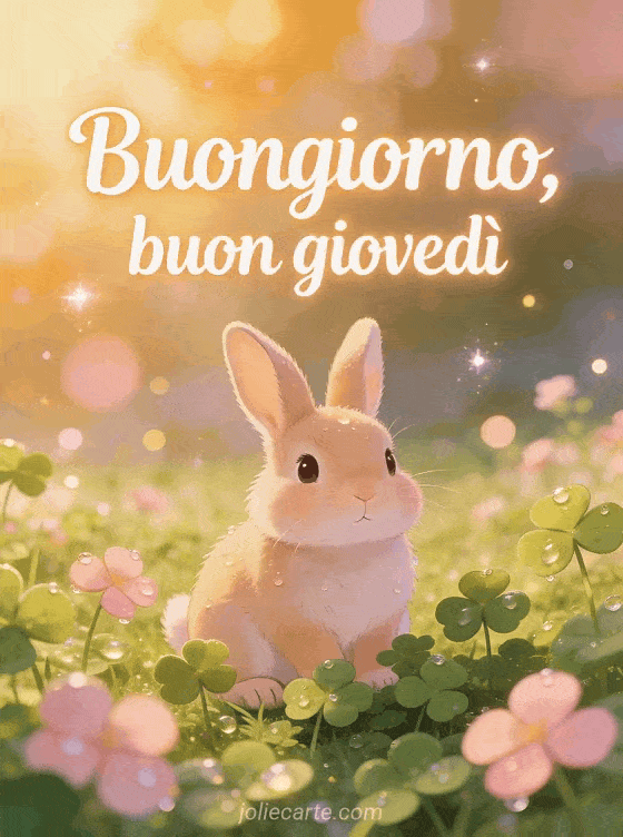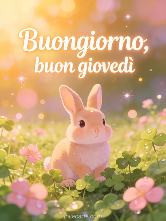 Invia un saluto carino di buongiorno buon giovedì con un coniglio seduto in un prato di quadrifogli, rugiada del mattino e fresca luce primaverile. Scopri anche immagine animata buon giovedì, buon giovedì soleggiato immagini o belle immagini buon giovedì baci.