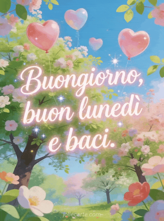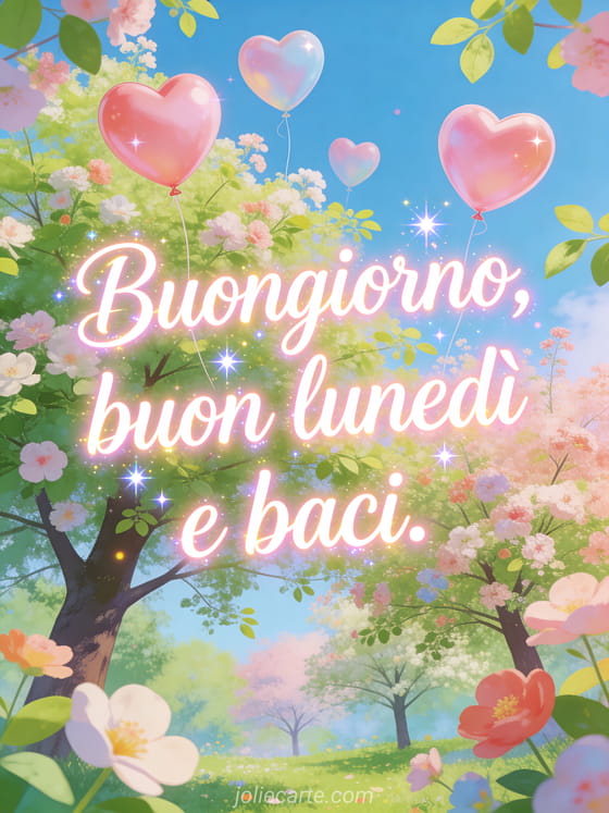 Invia buongiorno, buon lunedì e baci con palloncini a forma di cuore che fluttuano sopra alberi primaverili. Scopri anche buon lunedì soleggiato gif, lunedì baci immagini o buon lunedì umorismo divertente.