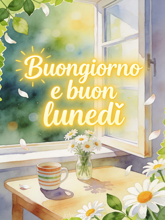 Inizia la settimana con un buongiorno e buon lunedì in lettere gialle piene di luce. Questa cartolina gratuita mostra un tavolo da colazione, una tazza a righe, margherite e una finestra aperta per portare freschezza e buonumore. Scopri anche una buongiorno buon lunedì gif animata, una gif buon lunedì donna o una immagine buongiorno buon lunedì.