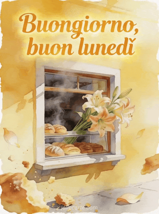 Invia buongiorno buon lunedì immagini gif con lettere gialle e solari ad acquerello, una piccola vetrina di pasticceria, dolci fumanti e amarilli che si sporgono oltre il bordo. Potrebbero piacerti anche questo buongiorno buon lunedì gif, queste belle immagini per augurare un buon lunedì o questo buon lunedì fiori gif.