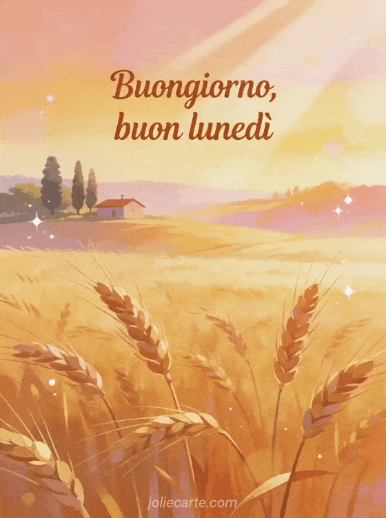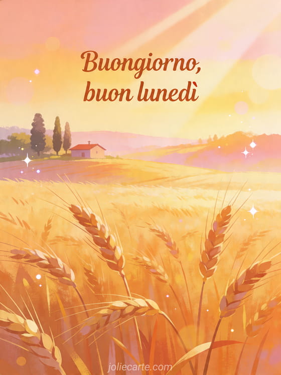 Invia un biglietto di Buongiorno, buon lunedì con un campo di grano dorato nella luce del mattino per iniziare la settimana con calma. Scopri anche buon lunedì immagine, buon lunedì divertente e buon lunedì e buona settimana.