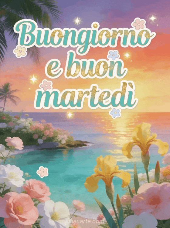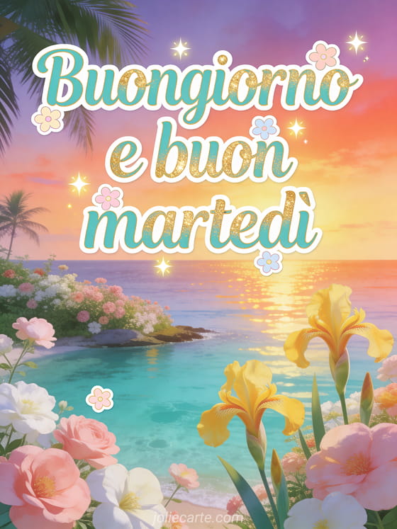 Invia un saluto dolce di buongiorno e buon martedì con lettere turchesi, tocchi dorati, fiori pastello, stelle luminose, una baia turchese al crepuscolo corallo e viola e iris gialli accanto al mare calmo. Puoi vedere anche questa immagine divertente buon martedì umorismo, questa buongiorno martedì cartolina o questa immagine gratis buon martedì baci.