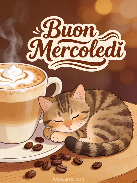 Rallegra il mercoledì di qualcuno con questa calda cartolina di caffè con un adorabile gatto tigrato arrotolato accanto a una tazza di latte. Scopri anche emoji buon mercoledì o mercoledì baci gifs.