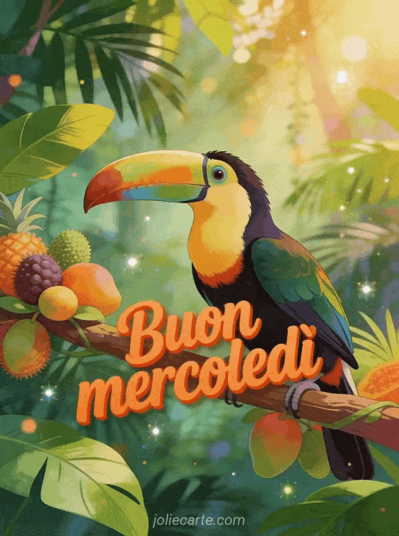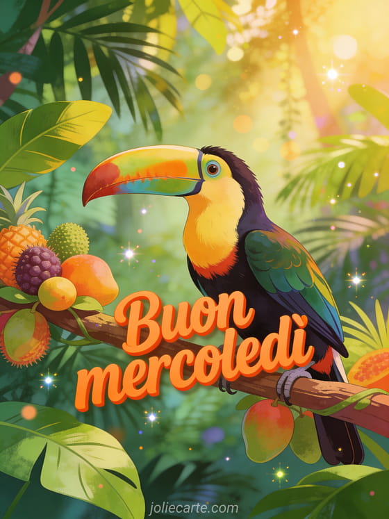 Invia un saluto colorato di buon mercoledì con un tucano appollaiato accanto a frutta esotica in una giungla rigogliosa, luce dorata e colori tropicali vivaci. Scopri anche cartolina buon mercoledì baci, buon mercoledì soleggiato immagini o testo per augurare un buon mercoledì.