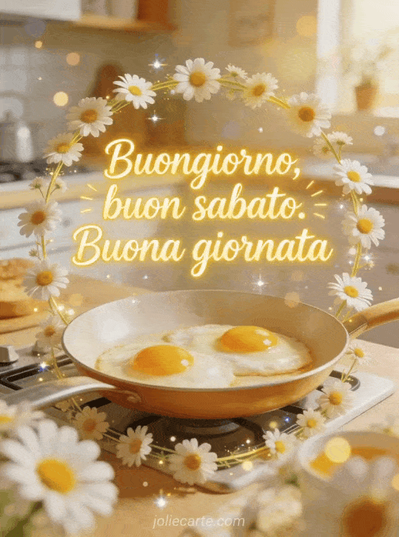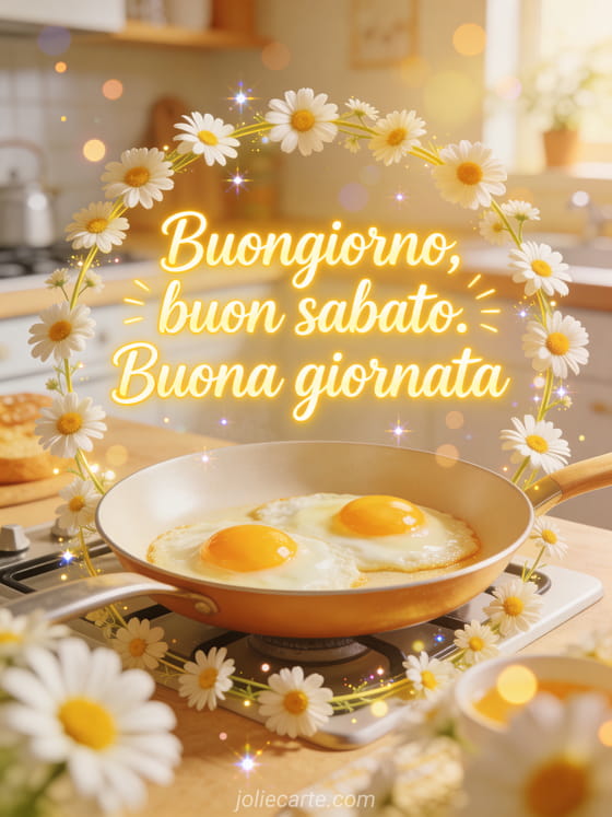 Condividi un saluto luminoso di buongiorno e buon sabato con scritta giallo sole, bordo di margherite e un angolo colazione con uova all'occhio di bue. Scopri anche un biglietto di buon sabato e buon weekend con baci, una immagine di buon sabato e buon weekend o un biglietto buongiorno buon sabato di Natale.