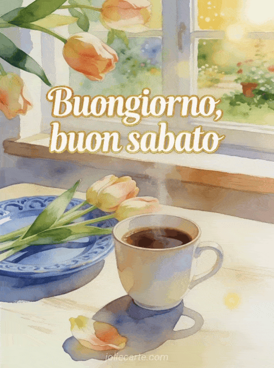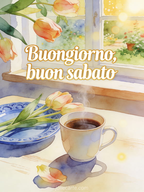 Inizia il weekend con un saluto caloroso di buongiorno e buon sabato in lettere bianche nitide con contorno dorato. Questa cartolina gratuita mostra un angolo colazione accogliente, una tazza di caffè fumante, tulipani freschi e un piattino blu vicino a un giardino soleggiato alla finestra. Scopri anche una buon sabato gif animata, un buonissimo sabato gif o immagini gratis buon sabato e buon weekend.