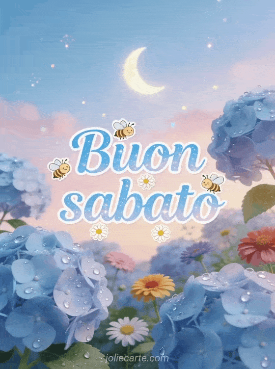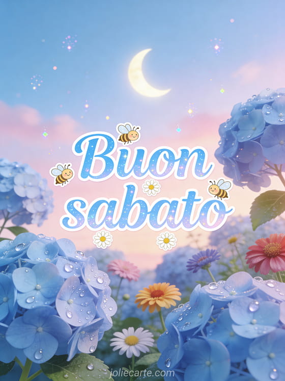 Invia un buon sabato delicato con ortensie blu, zinnie colorate, api allegre, rugiada scintillante e una mezzaluna luminosa in un cielo crepuscolare. Scopri anche buon sabato al caldo, buongiorno buona giornata buon sabato o una buon sabato baci immagine.
