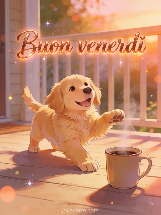 Condividi un saluto gioioso del venerdì mattina con un soffice cucciolo di golden retriever che si stiracchia su una veranda accanto a una tazza di caffè fumante. Scopri anche una cyber cartolina buon venerdì, belle immagini per augurare un buon venerdì o un buon venerdì umorismo gif.